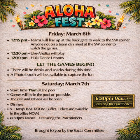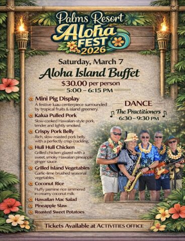ALOHA FEST will begin at 12:15 in the South West Corner of The Palms.