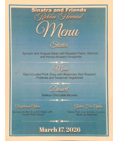 The Menu by Chef Lucy : Dijon-Crusted Pork Chops finished with fresh Rosemary, Red Roasted Potatoes and seasonal garden vegetables, Signature Bailey’s Chocolate Mousse.