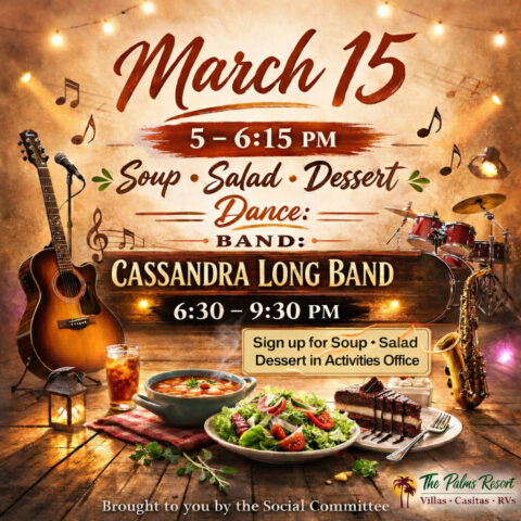 Please sign up in the Activities Office and let us know what kind of Soup, Salad or Dessert you are bringing.