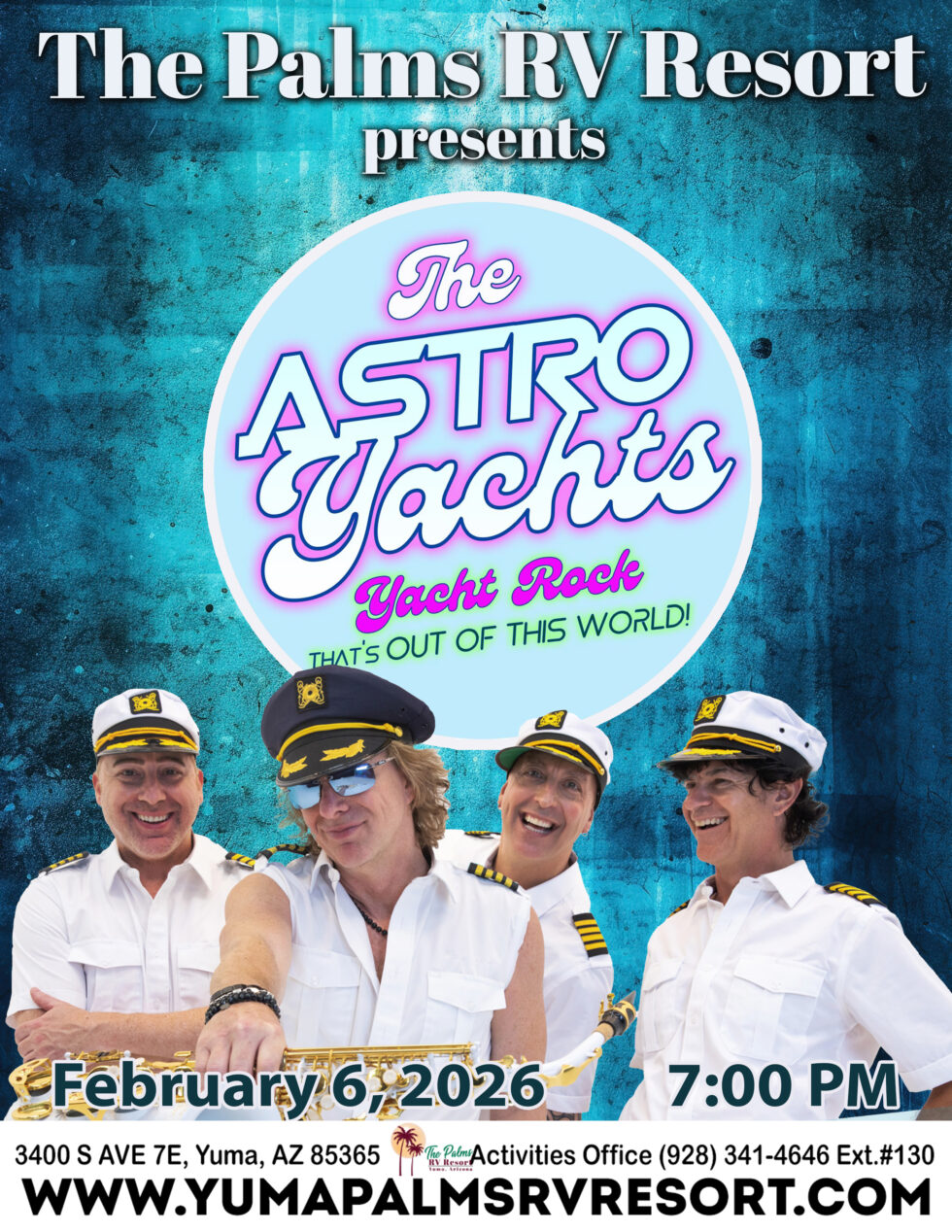 Have you heard of the Astro Yachts? This Los Angeles–based yacht rock tribute band delivers energetic, fun, and highly polished performances of classic AM Gold and smooth yacht rock hits from the ’70s and ’80s. One watch of their video and you’ll be hooked! Don’t miss your chance to see them live at the Palms on February 6 at 7:00 PM—tickets are available at the Activities Office.