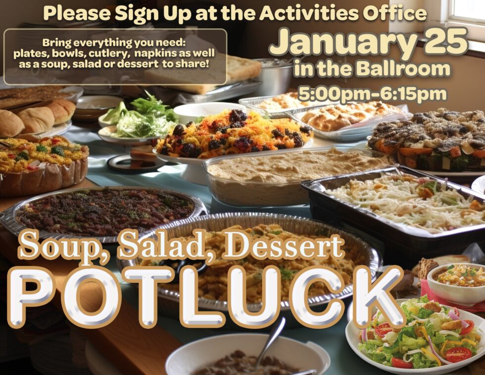 Have you ever joined one of our Community Potlucks? If not, it couldn’t be easier to take part. Simply stop by the Activities Office to register and note the dish you plan to bring on the sign-up form.